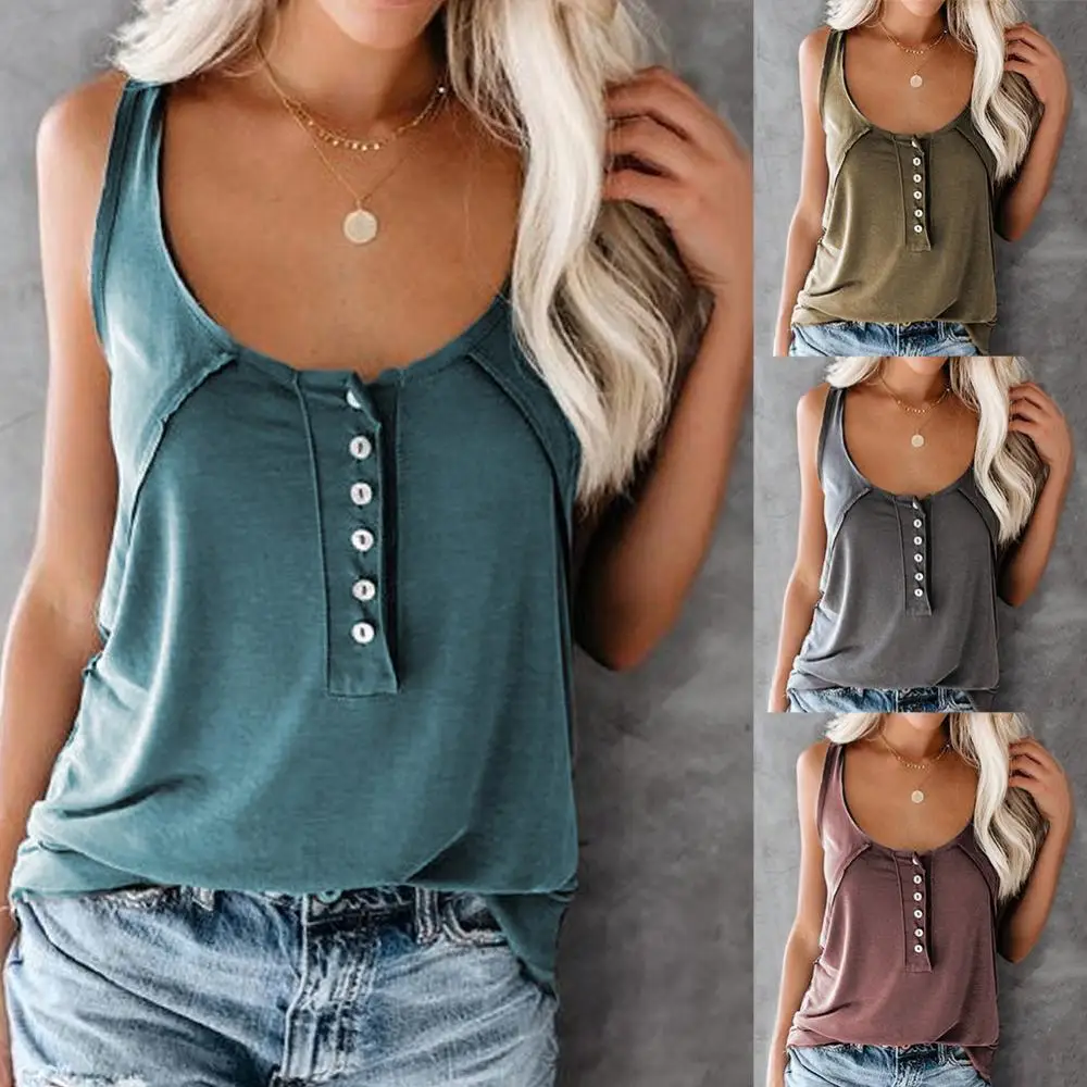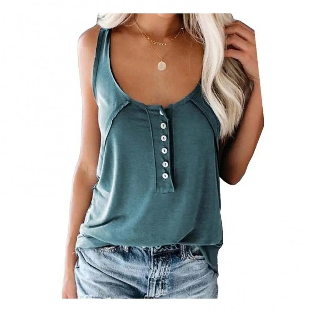 Women Fashion Solid Color Scoop Neck Buttons Vest Camisole Loose Blouse Top